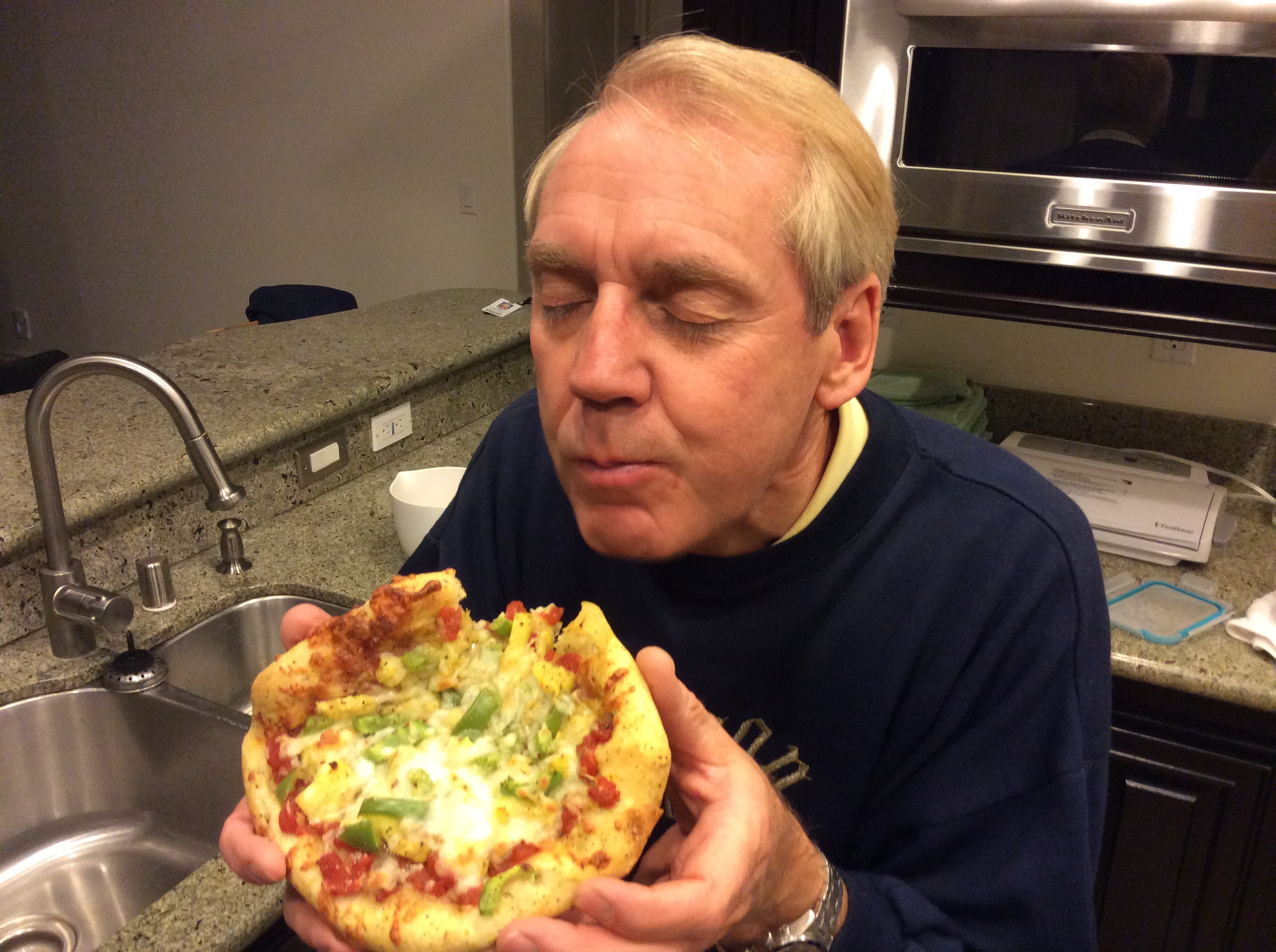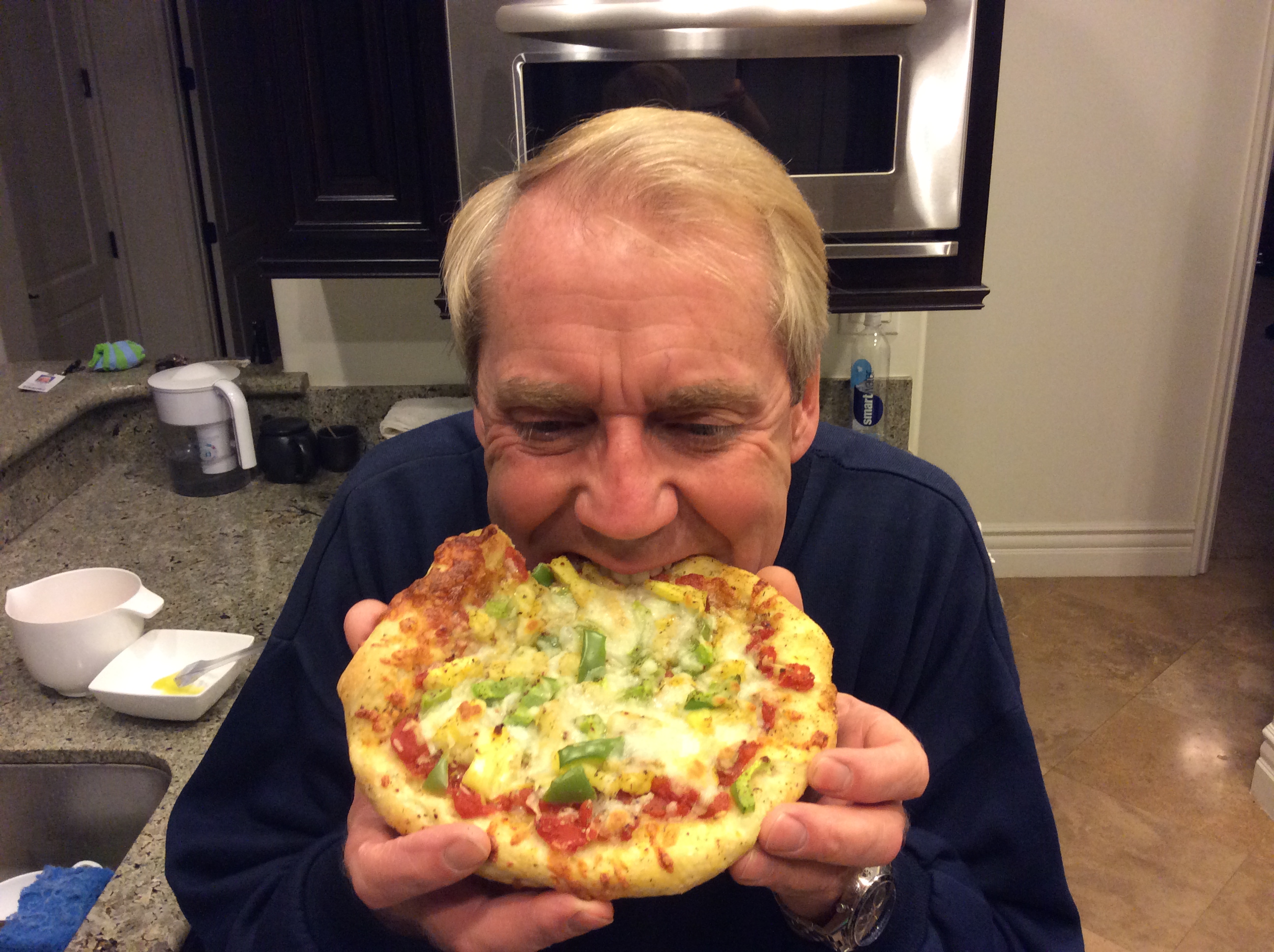 Homemade pizza is tricky, unless you have a Trader Joe’s nearby and can use their Pizza Dough (Plain Vegan), Then its easy and the “homemade” crust is perfect. PizzaWhen I went to cut the pizza my dear husband had the entire pizza in his hands and “going down” before I could even cut it. There’s the proof of success! As he grabbed the pizza I grabbed the camera…photo 1 (1)Mmmmm….I heard the low humming of gastronomic satisfaction. photo 2Then I turned the camera on the dog sitting nearby. Even Cypher, our Weimaraner, was enthralled by the scene, eternally waiting for a share in the human enterprise…. Cypher and eternally disappointed. CypherI knew what he was thinking, “Why you and not me?! Why would I be left out? When is it coming my way?” The existential questions abounded. Wait, that’s what I would have been thinking. Here’s what he was thinking, “Mmmm, me, me, me.”